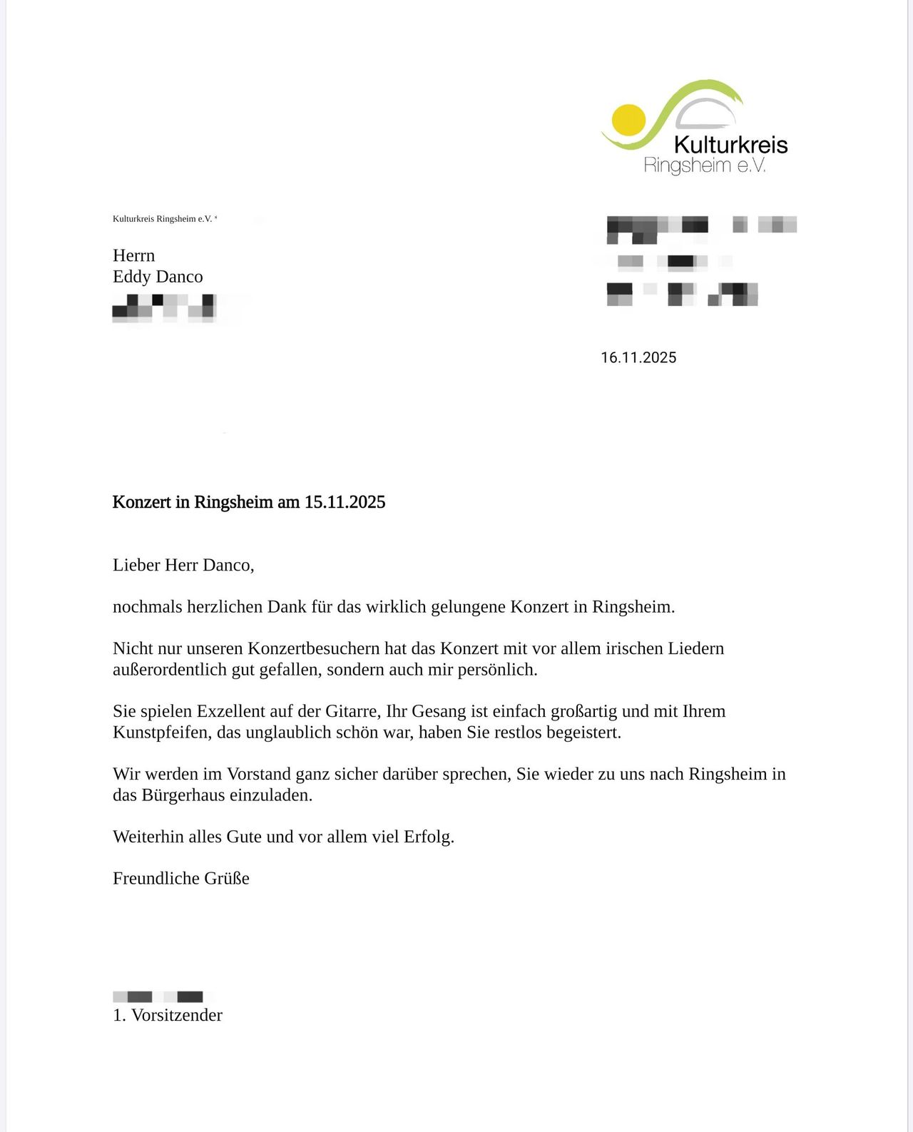 Ich freue mich auf Ihre Einladung mit meinem schönen Konzert (Liederabend) »From Raglan Road to Streets Of London - irische, schottische und andere Lieder« und meinem abwechslungsreichen Repertoire »Lieder – Songs – Chansons«. Planen Sie möglichst langfristig, damit wir uns nicht verpassen.